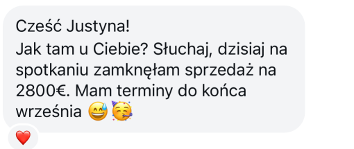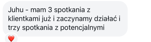 Pierwsze efekty możesz zobaczyć nawet w ciągu kilku dni, jeśli wdrożysz wszystko od razu. To nie kurs, który trzeba „przerabiać” tygodniami po obejrzeniu możesz od razu zacząć pisać wiadomości i zdobywać klientów.